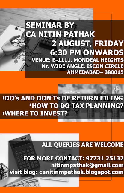 Free S/o 2nd August'19, Friday at B1111, Mondeal Heights, Iscon Circle, A'bad on CTC planning, New changes in budget, Do's/Don'ts on Filing IT return, Index fund qua other investments, NPS (IRR on investment).